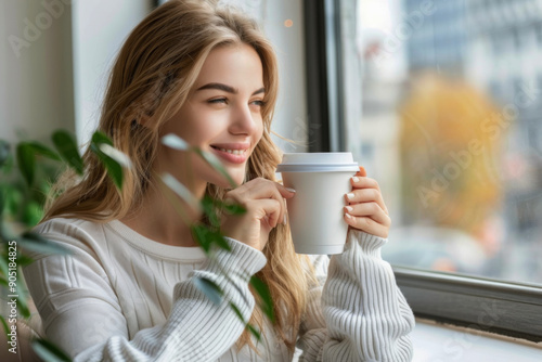 Beautiful young woman drinking coffee looking outside through the window