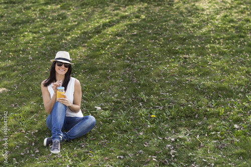 beautiful young woman enjoying an orange juice in a park.She is wearing hat and sunglasses.