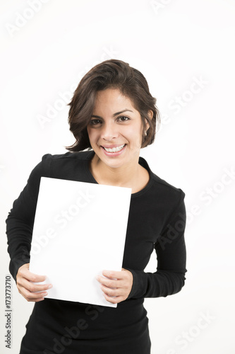Beautiful young woman holding a blank sheet of paper