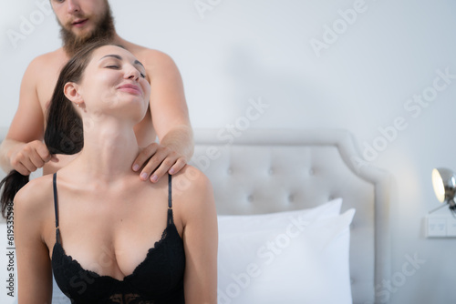 Beautiful young woman in black lingerie and her boyfriend in bedroom