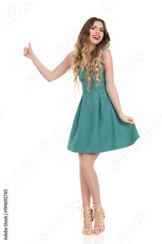 Beautiful Young Woman In Green Mini Dress And High Heels Is Showing Thumb Up And Laughing