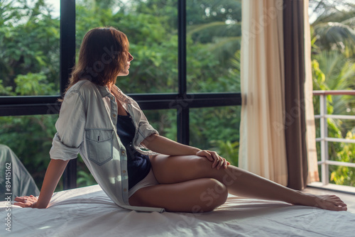 Beautiful young woman is laying on the bad and looking through