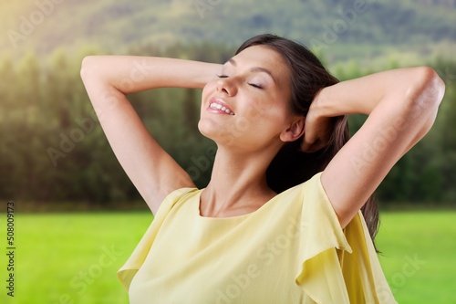 white, down, smile, closeup, human, tree, leisure, attractive, park, green, spring, power, organic, flower, wellness, field, adult, enjoy, grass, whitening, summer, outside, casual attire, freedom, female, teeth, countryside, zen, healthy