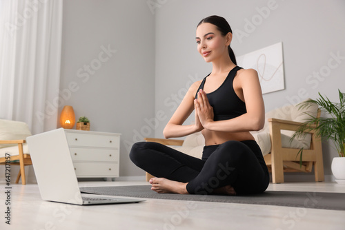 adult, angle, asana, background, balance, beautiful, body, calm, caucasian, class, coach, computer, concentration, energy, exercise, female, figure, flexible, harmony, healthy, home, indoor, laptop, lesson, lifestyle, lotus, low, mat, meditating, meditation, namaste, online, person, pose, position, practice, practicing, relaxation, spiritual, sport, video, view, watching, well-being, wellness, woman, yoga, young