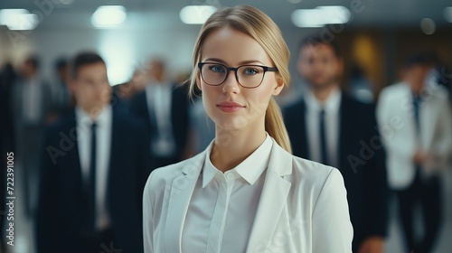 Beautiful young woman scientist in modern medical science laboratory with team of specialists