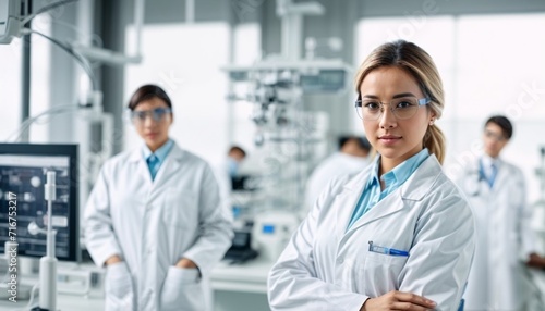 Beautiful young woman scientist wearing white coat and glasses in modern Medical Science Laboratory with Team of Specialists on background.