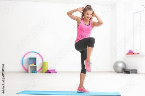 activity, athlete, attractive, background, beautiful, body, care, caucasian, club, effort, energy, exercise, female, fit, fitness, floor, gym, health, healthy, indoor, leg, leisure, lifestyle, loss, mat, motivation, muscle, muscular, person, pose, position, power, practicing, recreation, shape, sport, activewear, sporty, training, weight, white, woman, physical exercise, young