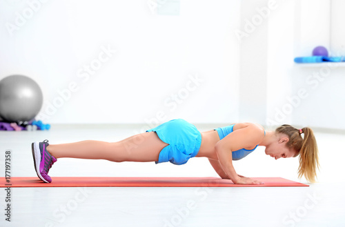 activity, athlete, attractive, background, beautiful, body, care, caucasian, club, effort, energy, exercise, female, fit, fitness, floor, gym, health, healthy, indoor, leisure, lifestyle, light, loss, mat, motivation, muscle, muscular, person, plank, pose, position, power, practicing, recreation, shape, sport, activewear, sporty, training, weight, white, woman, physical exercise, young