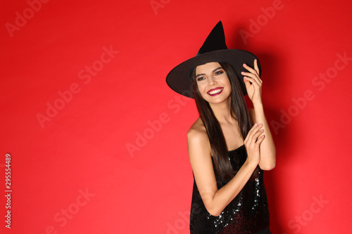 Beautiful young woman wearing witch costume for Halloween party on red background, space for text