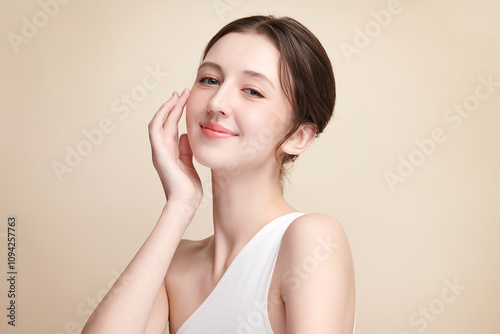 Beautiful young woman with clean fresh skin on beige background, Face care, Facial treatment, Cosmetology, beauty and spa, women portrait.