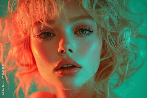 Beautiful young woman with curly hair posing against colorful lighting in a creative portrait setup