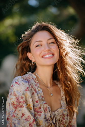 Beautiful young woman with flowing hair and floral blouse smiling outdoors in natural sunlight