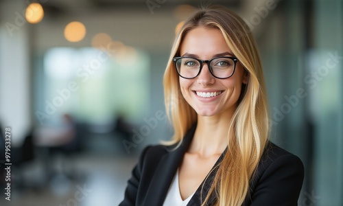 Beautiful young woman with long blonde hair, business casual attire, blur office background