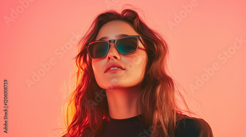 Beautiful Young Woman with Long Hair Enjoying on Rosy Background – Trendy Sunglasses Photoshoot. young woman, long hair, trendy sunglasses, photoshoot, rosy background, relaxing po