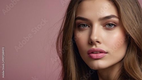 Beautiful young woman with long hair posing on background. Healthy skin and long smooth hair. Pink lips, strands on the face