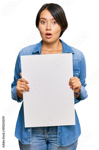 Beautiful young woman with short hair holding blank empty banner scared and amazed with open mouth for surprise, disbelief face