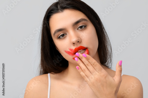 Beautiful young woman with smeared red lipstick on grey background, closeup