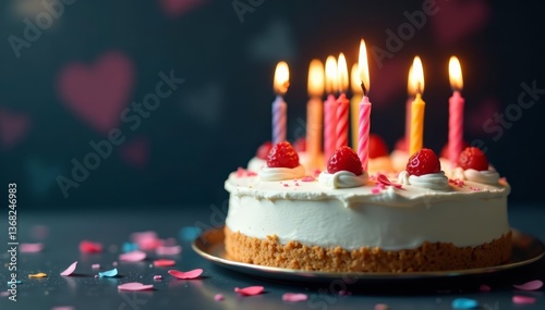 Beautifully decorated birthday cake with glowing candles, happy, celebratory