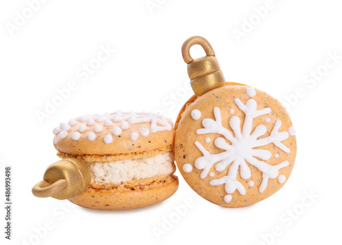 Beautifully decorated Christmas macarons on white background