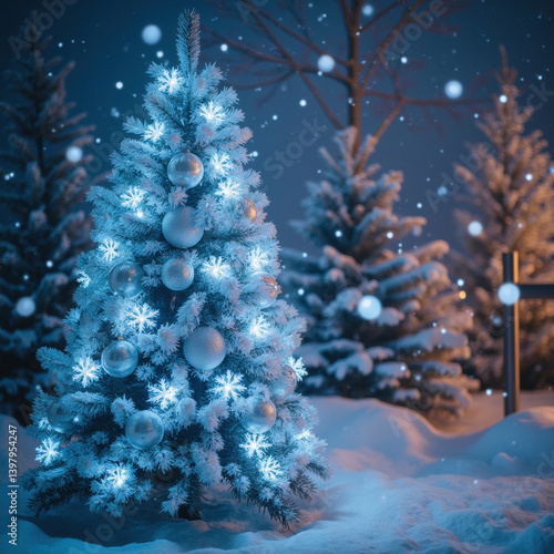 beautifully decorated Christmas tree with glowing lights and ornaments stands amidst snowy landscape, creating magical winter scene