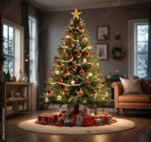 beautifully decorated Christmas tree with ornaments and lights, christmas tree, holiday decor, elegant centerpiece