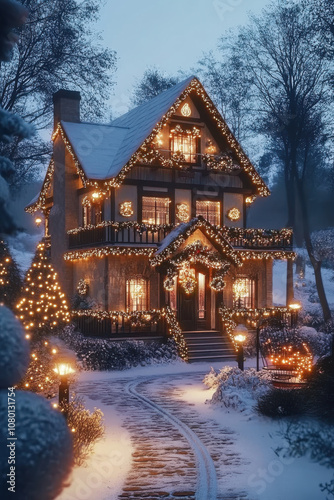 beautifully decorated house with festive lights and snow, creating cozy winter atmosphere. warm glow from windows invites sense of holiday cheer and joy