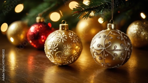 Beautifully designed golden Christmas baubles hanging on a tree, radiating festive cheer in a warm, cozy setting