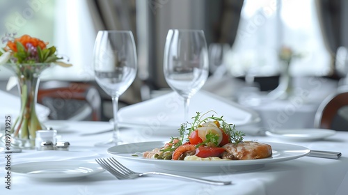 Beautifully plated gourmet dishes on a luxurious white tablecloth, highlighting culinary elegance. 32k, full ultra HD, high resolution