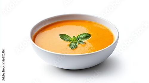 Beautifully presented steaming hot bowl of savory and delicious vegetable soup elegantly garnished with fresh green herb leaf