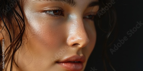 Beauty and skincare focused on a womans face, featuring space for makeup and cosmetics. Young model against a dark backdrop for luxury self-care and facial radiance