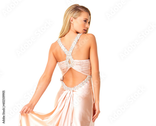 Beauty, glamour and fashion while wearing an elegant dress or evening gown as a bridesmaid or for prom against white studio background. Beautiful woman showing back detail for fancy party or event