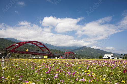 horizontal, travel, tourist resort, color image, nobody, field, plant, flower, blossom, mountain, bridge, red, wild, pink, yellow