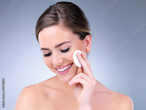 Beauty is about enhancing what you have. Studio portrait of an attractive young woman using a cotton pad on her face against a gray background.