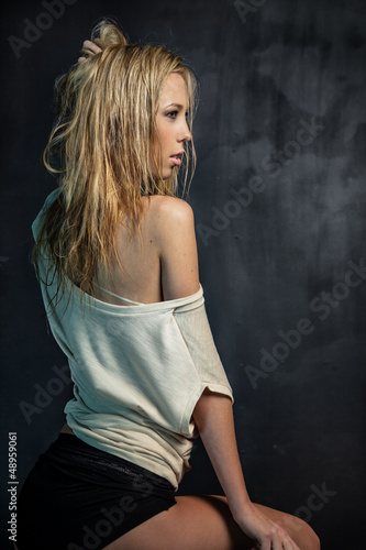 adult, background, beautiful, beauty, caucasian, shirt, desire, elegance, flying, wind, fashion, female, fresh, girl, gorgeous, grey, hair, coiffure, hand, head, human, lady, make-up, model, modern, natural, 1, people, person, portrait, posing, sensuality, sexy, studio, style, vogue, white, woman, young, blond, casual attire, clothing, shoulder, elegant, lifestyle, pose, trendy, wall, passion, panty