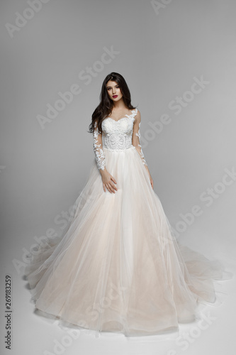 Beauty portrait of bride wearing fashion wedding dress with with luxury delight make-up and hairstyle, studio indoor photo. Young gorgeous brunette caucasian model.