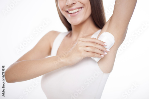 Beauty shot of young beautiful brunette woman applying roll-on deodorant.