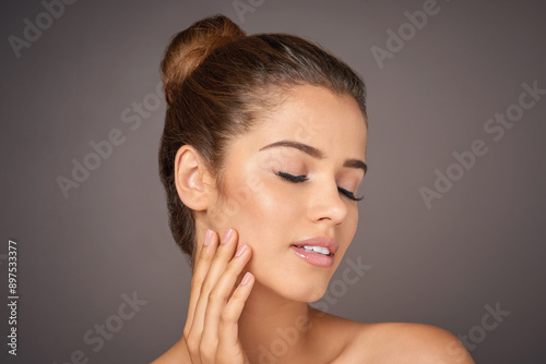 Beauty, touch and face of woman in studio for cosmetics, wellness and satisfaction. Dermatology, spa aesthetic and person with eyes closed for healthy skin, salon and makeup on gray background