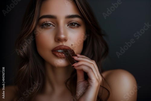 woman, beauty, face, female, fashion, model, make-up, young, pretty, portrait, glamour, person, adult, lipstick, sensuality, caucasian, chocolate, bar, background, closeup, style, lip, lady, attractive, mouth, bite, white, black, honed, cosmetic, look, bright, delicious, sexy, elegance, vogue, healthy, studio, brunette, taste, close, colours, stylish, skincare, hair, clean, cute, taking, eat