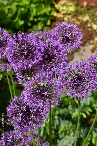 Bee on flower. Luxuriant purple allium flowers in shape of fluffy balls of tiny stars. Violet blue flowers of onion plant in garden on blurry background. Floral backdrop.