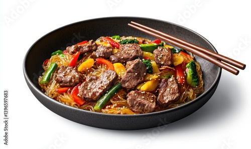 Beef and vegetable stir-fry in glass noodles, served in a black bowl with chopsticks. Food photography for restaurant menus