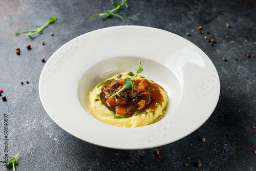 Beef cheeks with mashed potatoes and sauce demiglass on concrete table