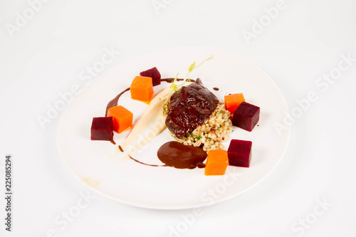 Beef cheeks with vegetables, roasted parsley root mousse , pearl barley, dark chocolate and demi glace sauce on a white background