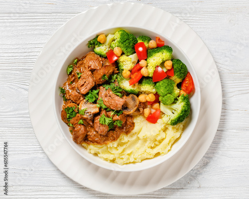 tender, american, served, table, brown, dinner, hot, salad, up high, delicious, mash, cooked, beef, white, wood, bowl, eatery, broccoli, ready to eat, mushroom, floret, mashed, food, meal, topview, steak, chickpea, chopped, meat, closeup, portion, cookery, stew, potato, tomatoes