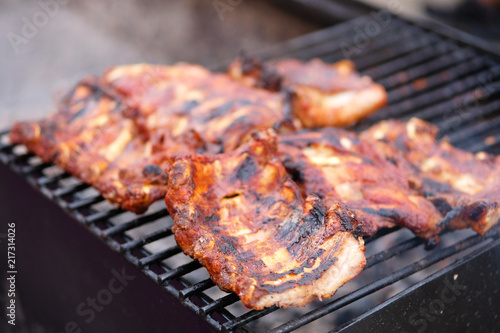 Beef ribs on grill grate in open air. Roasted meat on the fire. Traditional meat cooking.