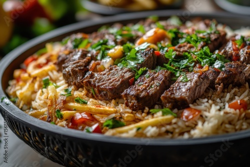 beef, dish, cook, slice, garnish, tasty, rustic, moody, closeup, table, dinner, meal, rice, potato, tomatoes, herb, cilantro, meat, food, grain, bowl, plate, parsley, stick, white rice, leaf, vegetable, prepared, cookery, eatery, nourishment, cooked, ingredient, serving