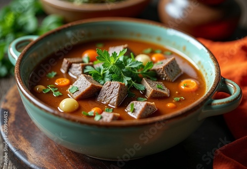 Beef soup in a green bowl with fresh vegetables, garnished with parsley, on a wooden table, copy space