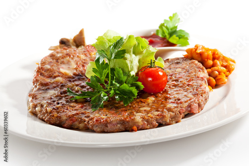 bacon, bar-b-q, bar-b-q, beef, beefsteak, cheese, cherry tomato, cooked, cookery, cut, delicious, dinner, dish, eat, fillet, food, fresh, freshness, fried, garlic, epicure, grill, grilled, hot, lunch, meal, meat, minced meat, mushroom, mushroom, onion, parsley, pepper, plate, pork meat, potato, red, roast, roasted, salad, sauce, served, steak, tasty, tomatoes, vegetable, white, isolated, white background