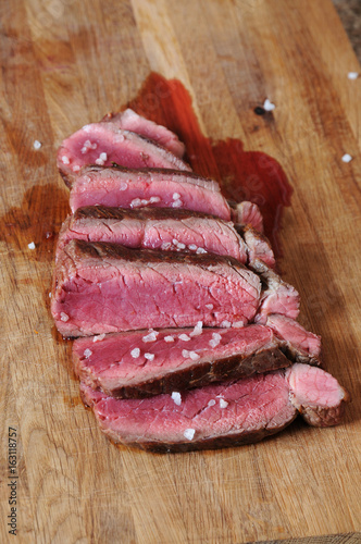 Beef steak is sliced on a wooden board. Sprinkled with coarse salt