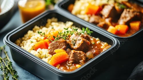 food, meal, cookery, lunch, dinner, take-out, container, stew, beef, couscous, carrot, onion, thyme, gravy, meat, protein, carb, vegetable, healthy, delicious, savoury, comfort, home, cooking, receipe, eat, epicure, tasty, appetising, dish, plate, gastronomy, culinary, prepared, ready, kitchen