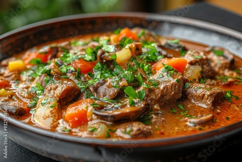 beef, stew, mushroom, carrot, parsley, brown, sauce, gravy, dish, bowl, food, dinner, meal, cookery, savoury, meat, vegetable, onion, delicious, healthy, hearty, comfort, warm, cooked, fresh, tasty, deliciously, appetising, aromatic, classic, rustic, traditional, comforting